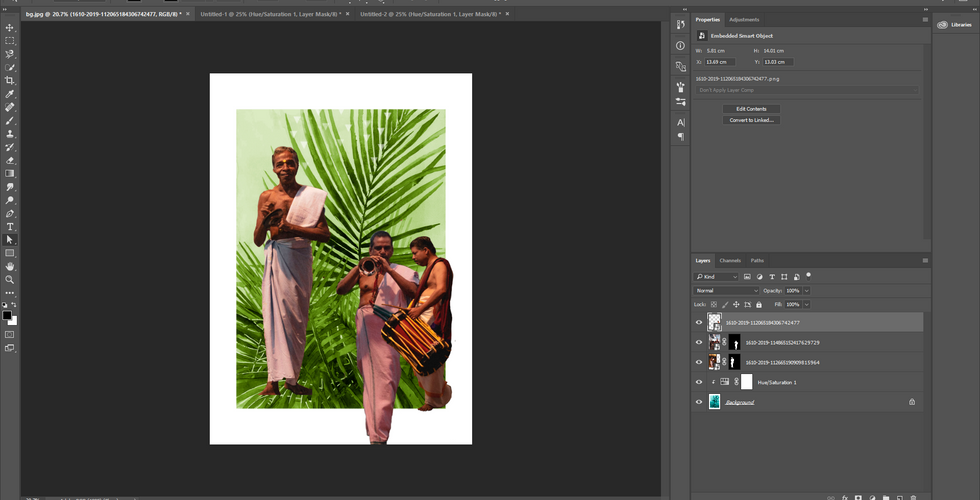 For the second digital manipulation, I used Photoshop and Wacom, to produce surreal like images. Wacom provided better control over the tools on Photoshop. The aim was to highlight the elements that make the concept of Muthappan stand out in a society constrained with social barriers created by caste and religion in India. By incorporating the images taken during my trip to Parassinikadavu Temple and watercolour background of coconut palm leaf (to represent Kerala- as Kerala is known for its rich coconut cultivation) I created three posters like images. Overall, I believe the outcomes meet my expectations and highlighted the elements well. The only challenge I had to face was to get control over the wacom as it was my first time working with one. After watching online tutorials, I feel confident to use it for my future projects as I really enjoyed working with Wacom.